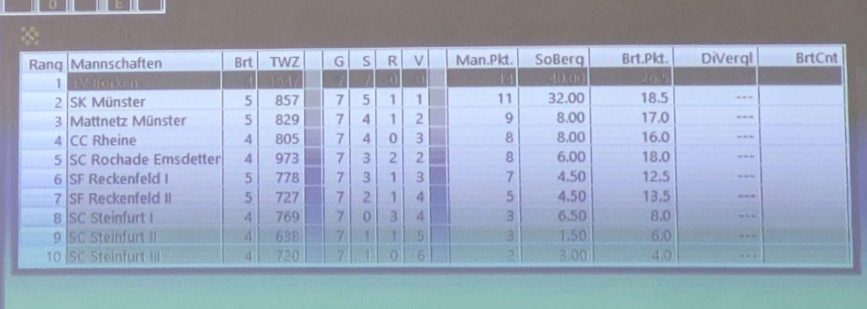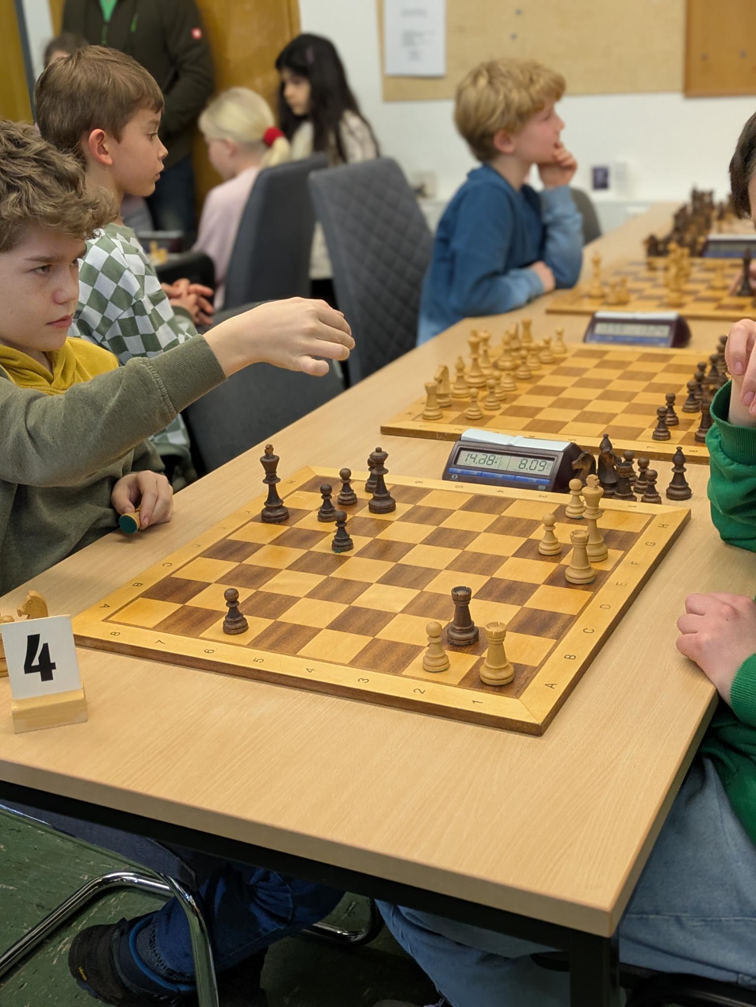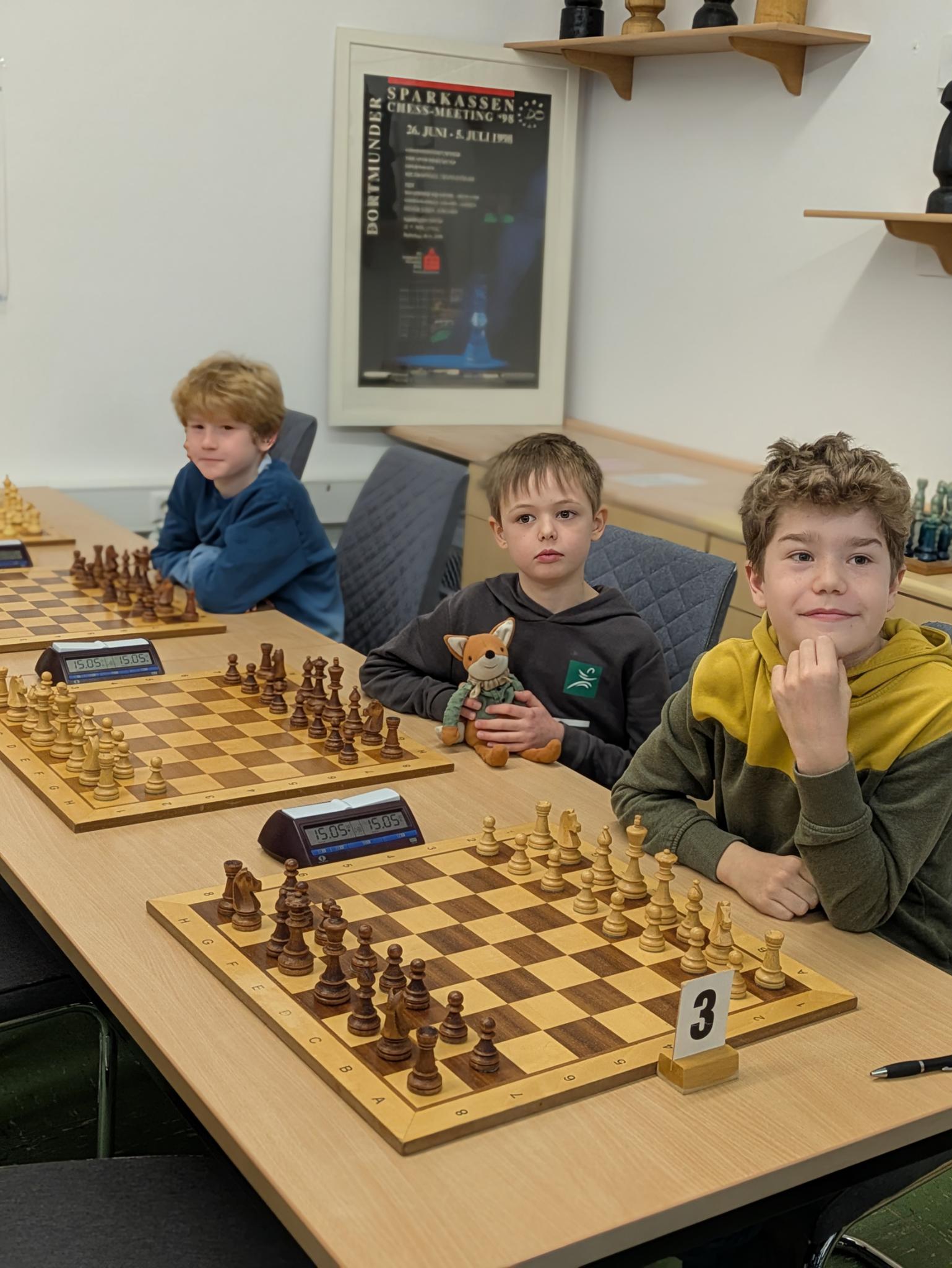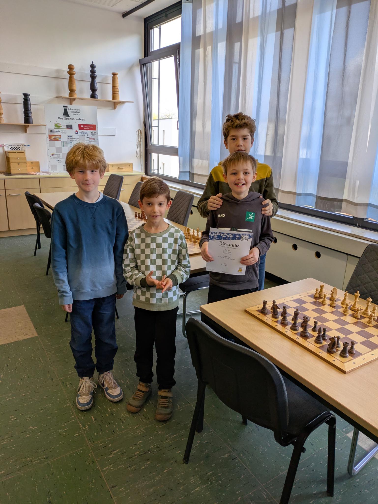 Drei Siege und zwei Unentschieden bei zwei Niederlagen war die Ausbeute der U14-Jugend des Schachclub Rochade Emsdetten bei den Verbandsmeisterschaften in Steinfurt. Jannis, Lukas, Lio und Ole erreichten damit einen hervorragenden geteilten 4.-5. Platz gemeinsam mit dem CC Rheine und hinter dem Turniersieger TV Borken, dem SK Münster 32 und den Newcomern von Mattnetz Münster. Hier eine kleine Fotogalerie: